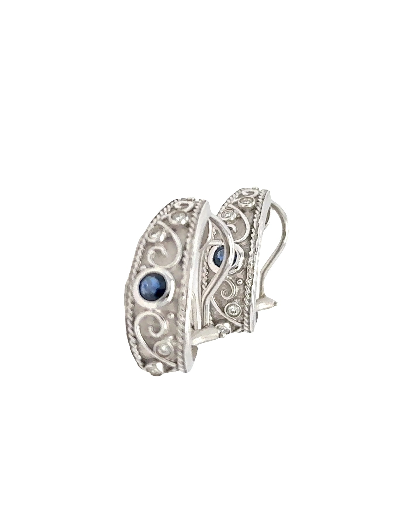 Elegantly crafted in 14k white gold, these 9.8-gram half hoop earrings exude modern sophistication. Each earring features a round sapphire at the center, beautifully accented by four small diamonds that add a subtle sparkle. Designed with flowing lines and graceful curves, the earrings showcase a soft matte finish that enhances their sculptural appeal. With a 1-inch drop and secure omega post backs, they are as comfortable as they are refined.